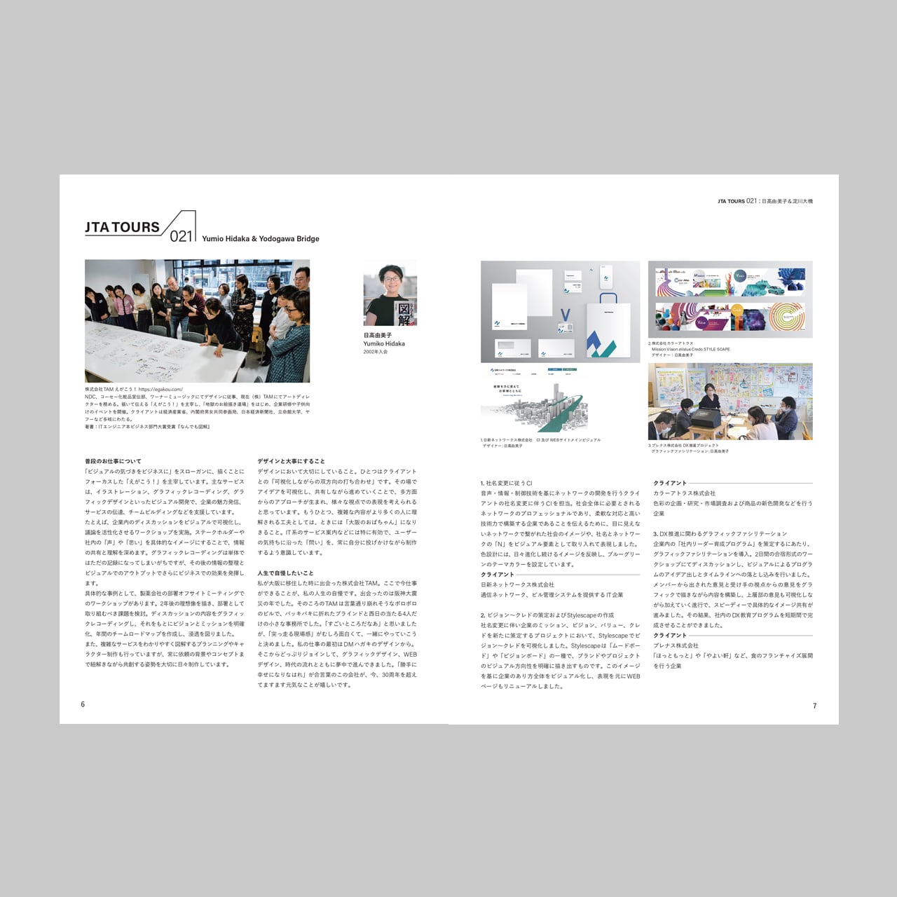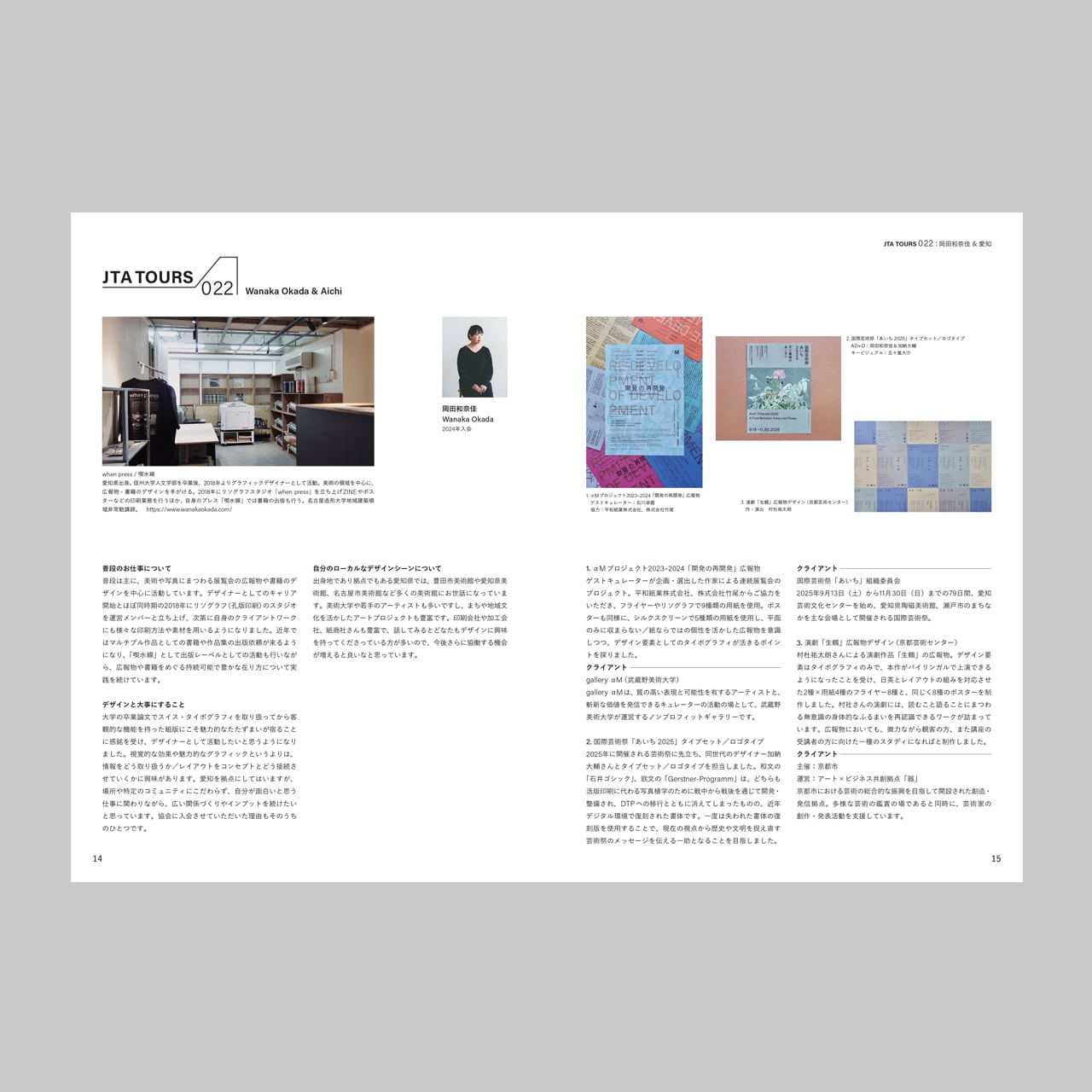 国内だけでなく海外にも散在している日本タイポグラフィ協会の会員を紹介するコーナー。タイポグラフィへの取り組み、デザインに対しての考え方、今後のチャレンジなどの内容とともに、普段のお仕事も拝見。さらに各会員が活動している地域のおすすめスポットを紹介。毎号2人が登場。
