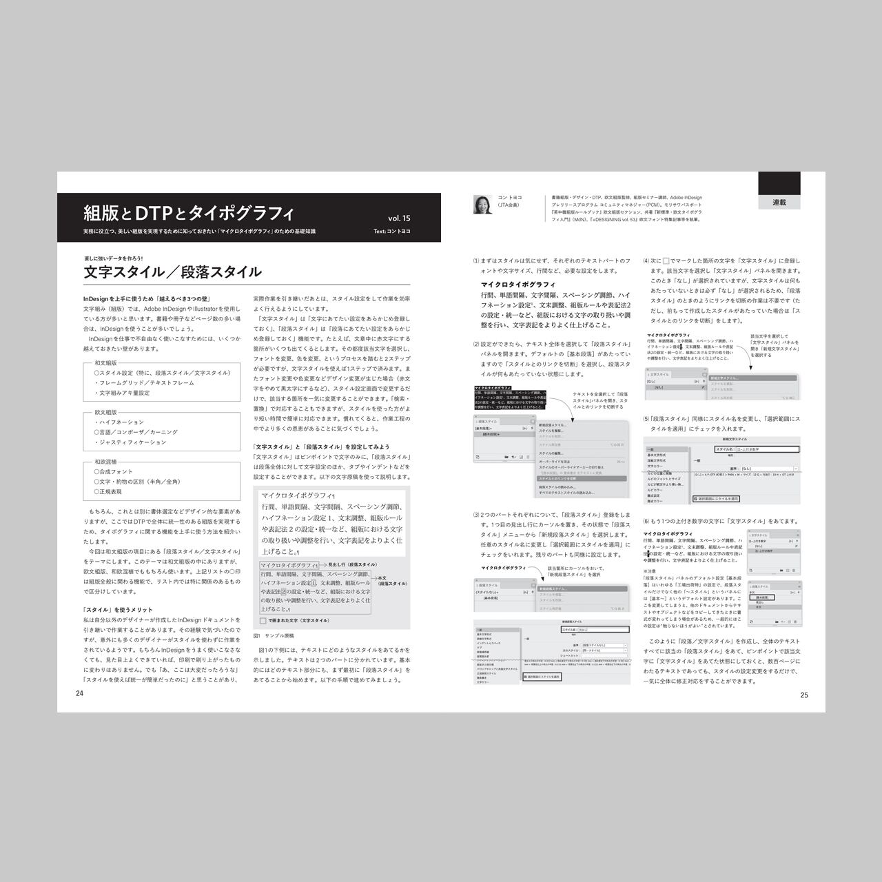書籍デザイン・組版・DTP、欧文組版監修、組版セミナー講師などに携わるコン トヨコによる、実務に役立つ、美しい組版を実現するために知っておきたい「マイクロタイポグラフィ」のための基礎知識。第15回では、InDesignの「文字スタイル」と「段落スタイル」機能を使って、効率的に組版する方法を紹介します。