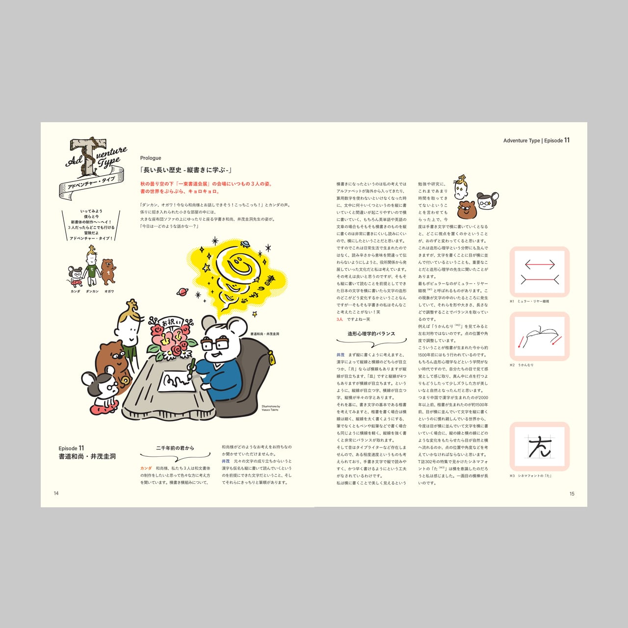 日本タイポグラフィ協会の新書体制作へと大冒険中のダンカン・オガワ・カンダ。「ダンカン、オガワ!今なら和尚様とお話しできそう!こっちこっち!」とカンダの声。係りに招き入れられた小さな部屋の中には、大きな座布団ソファの上にゆったりと座る字書き和尚、井茂圭洞先生の姿が。「今日は…どのような話かな…?」